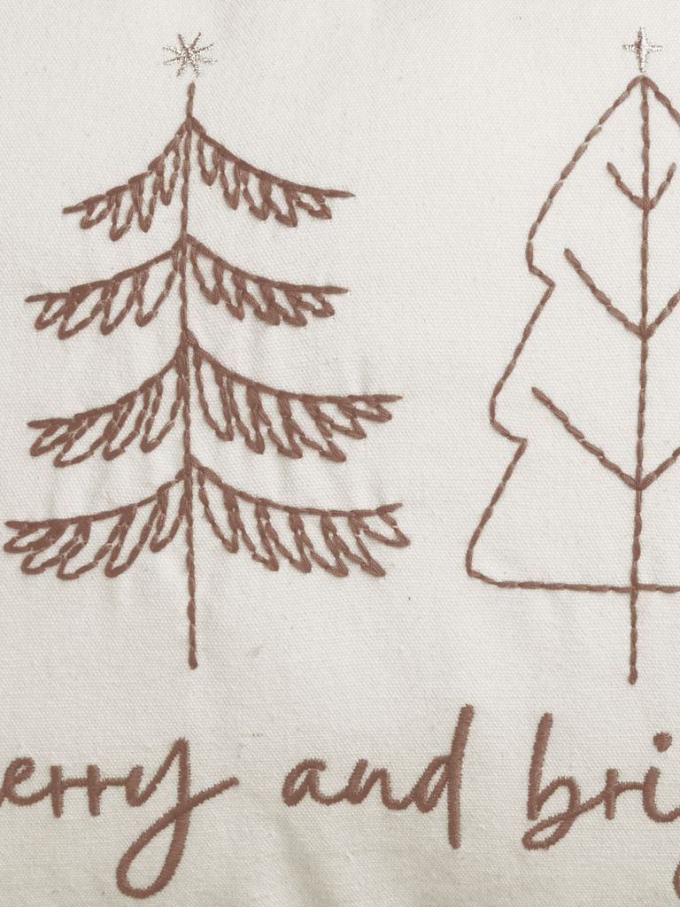Poduszka w beżowym kolorze z poszewką wykonaną w 100% z bawełny. Zdobi ją haft ze świerkami zwieńczonymi srebrnymi gwiazdami, nadając sofie lub fotelowi subtelny, świąteczny charakter. Zamek błyskawiczny ułatwia zdejmowanie poszewki do prania. 35x50 cm