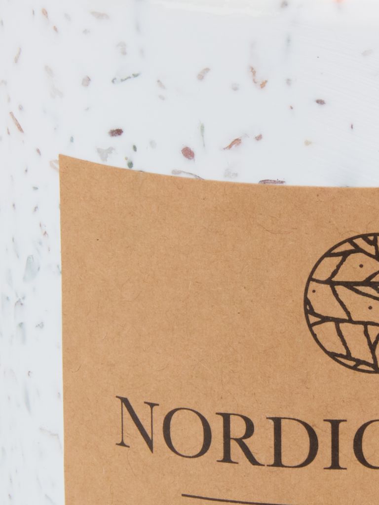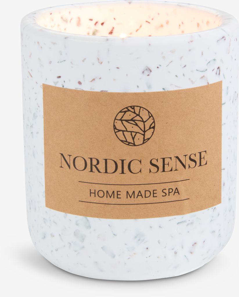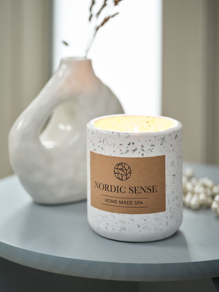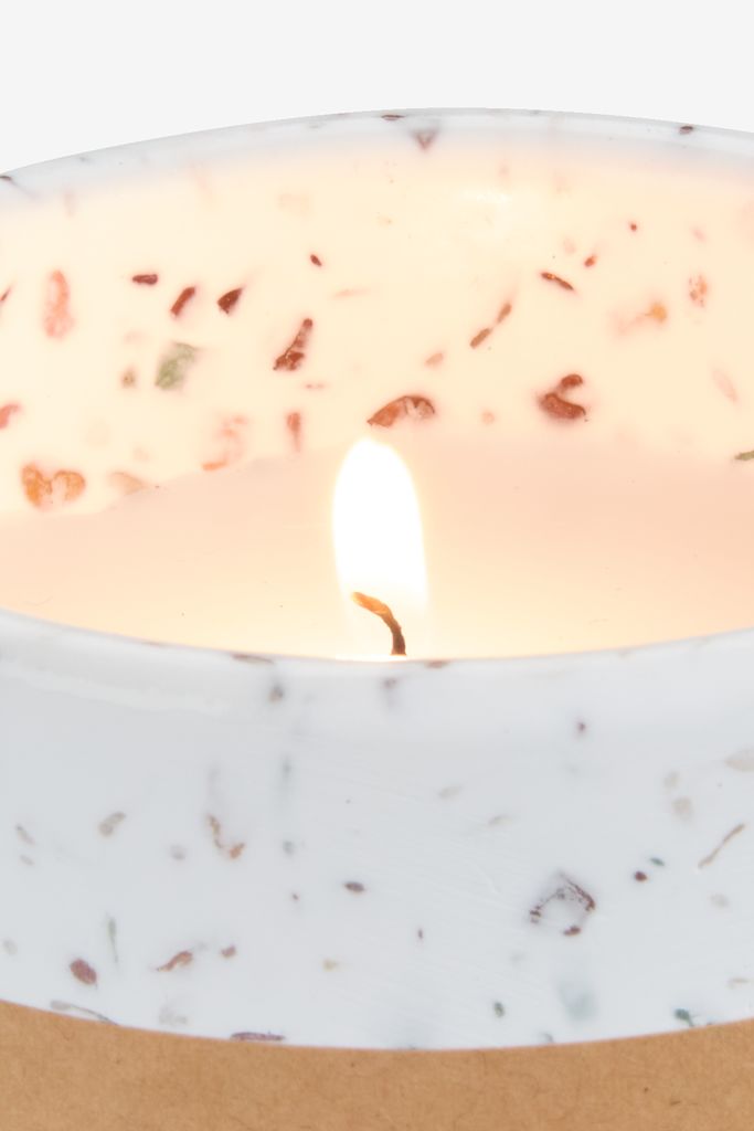Świeca zapachowa w pojemniku z terazzo w kolorze złamanej bieli. Stanowi stylowy dodatek do każdego wystroju domu, a świeca emituje subtelny i przyjemny zapach. Czas palenia wynosi około 20 godzin. Ś9 x W10 cm