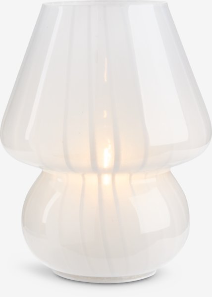 This glass lamp has a great timer giving light for up to 8 hours continuously and offers a good warm-white. It isn't flimsy glass and therefore quite robust with a subtle pattern of lines running through. Switch to ‘timer’ on the base, on first use, at the evening time you would like it to auto repeat each evening. i.e; 23:00 for auto switch off 07:00. Rechargeable batteries (3 x AAA) however are a must!! As the run time is up to approx 2 weeks before they need changing for another recharged set. Great if you away for the weekend, evening out or a power cut. 4 stars as low battery life. Otherwise value for money.