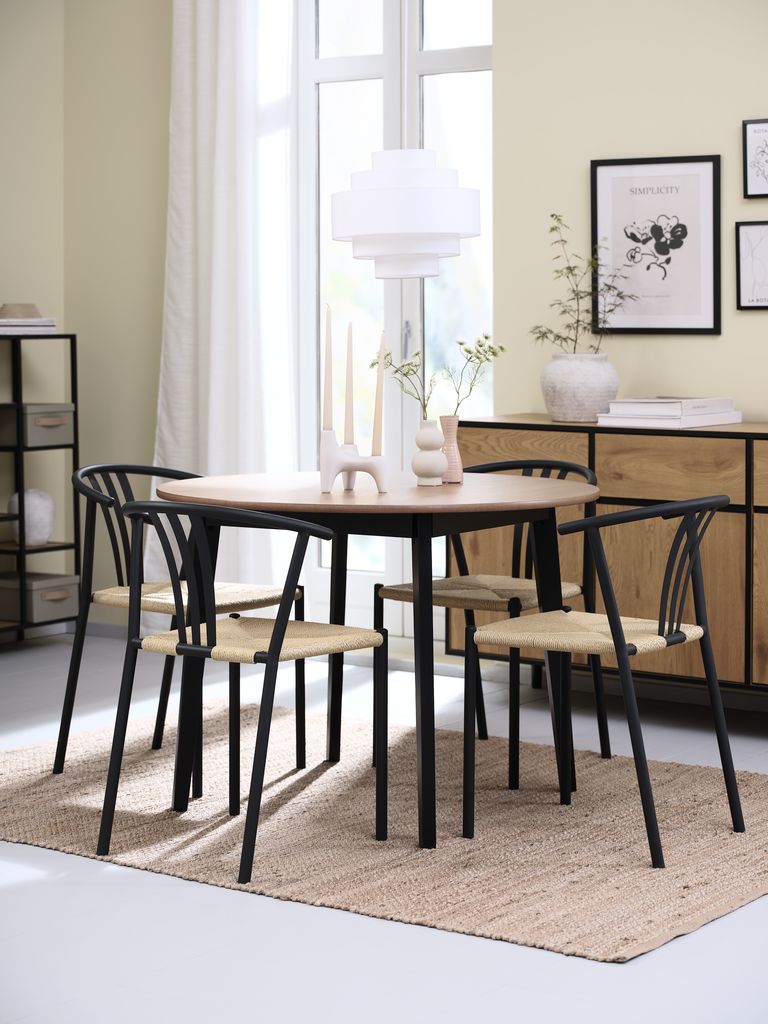 Stół: Lite drewno i okleina dębowa. Ś105 x W75 cm. Krzesło: Sznurek papierowy i stal.
