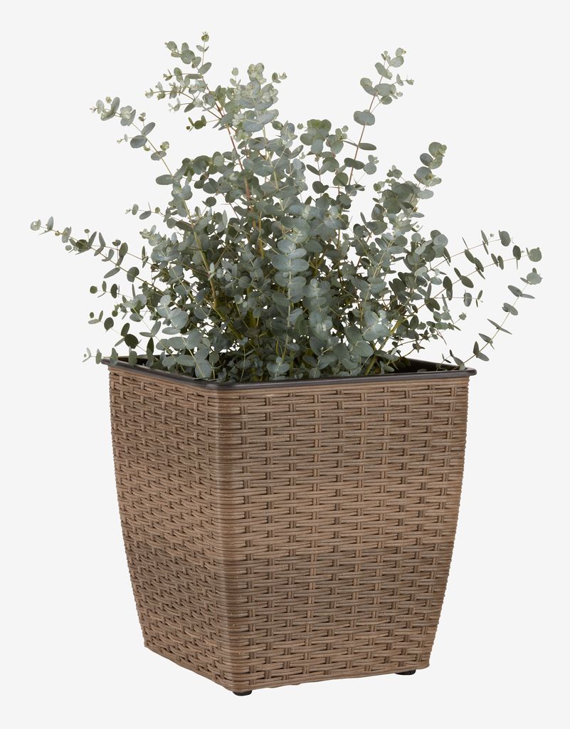 Lekki kosz na rośliny wykonany z technorattanu, plastiku i stali. Technorattan zapewnia naturalny wygląd wikliny, a jednocześnie jest odporny na warunki atmosferyczne. Ten kosz jest trwałą alternatywą dla naturalnych materiałów takich jak rattan. Łatwo można zrobić otwór odpływowy, aby usunąć nadmiar wody. Dostępny w różnych kolorach. S31 x D31 x W32 cm