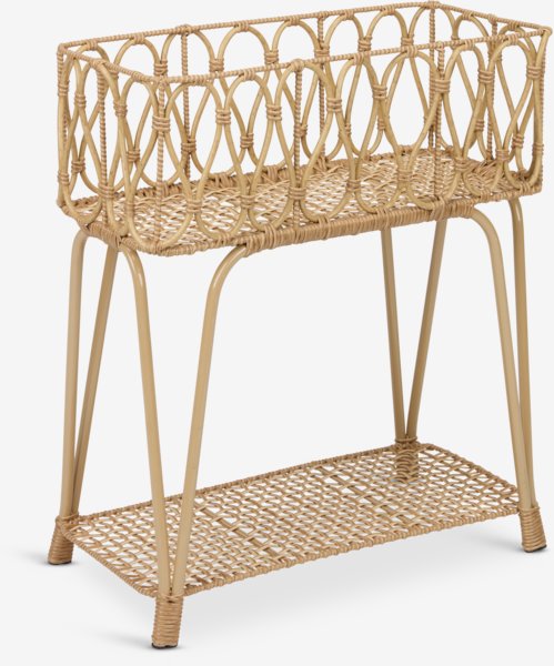 Stojak na rośliny z technorattanu i stali, na którym można wyeksponować doniczki z roślinami i kwiatami. Jest idealny na balkon, ponieważ można postawić kwiaty na górze i przechowywać rzeczy pod spodem. S25 x D50 x W60 cm