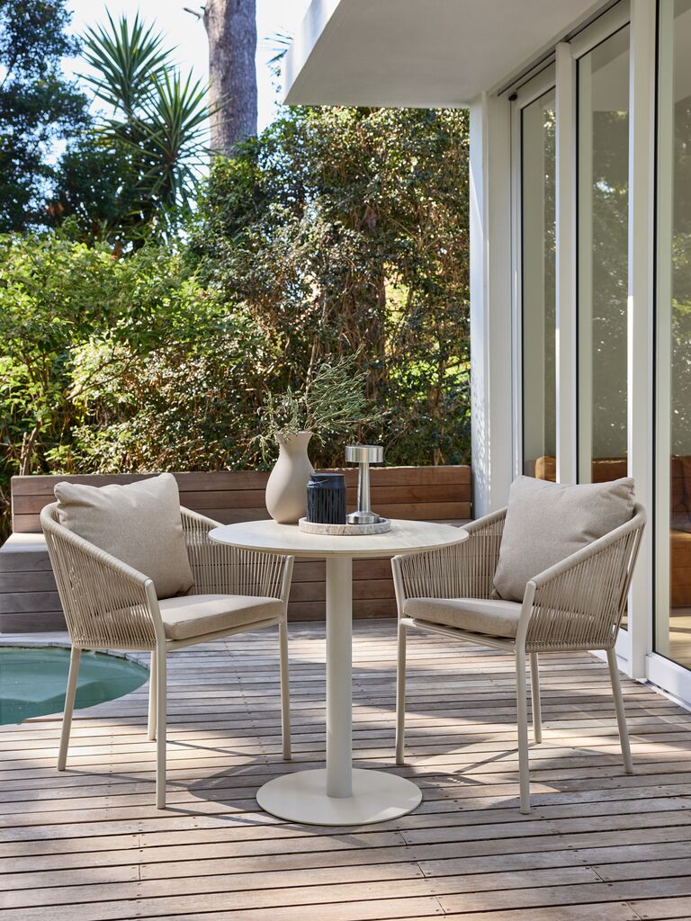 Beżowe krzesło ogrodowe wykonane z malowanego proszkowo aluminium, z oparciem z poliestru. W zestawie luksusowe poduszki z szybkoschnącym, strukturalnym pokrowcem. Pokrowiec posiada wodoodporną powłokę od wewnątrz, która zapobiega przedostawaniu się wody do poduszki. Aluminium jest lekkim i wytrzymałym materiałem, który nie rdzewieje. Krzesła ogrodowe można ustawiać jedno na drugim, co pozwala na kompaktowe przechowywanie.