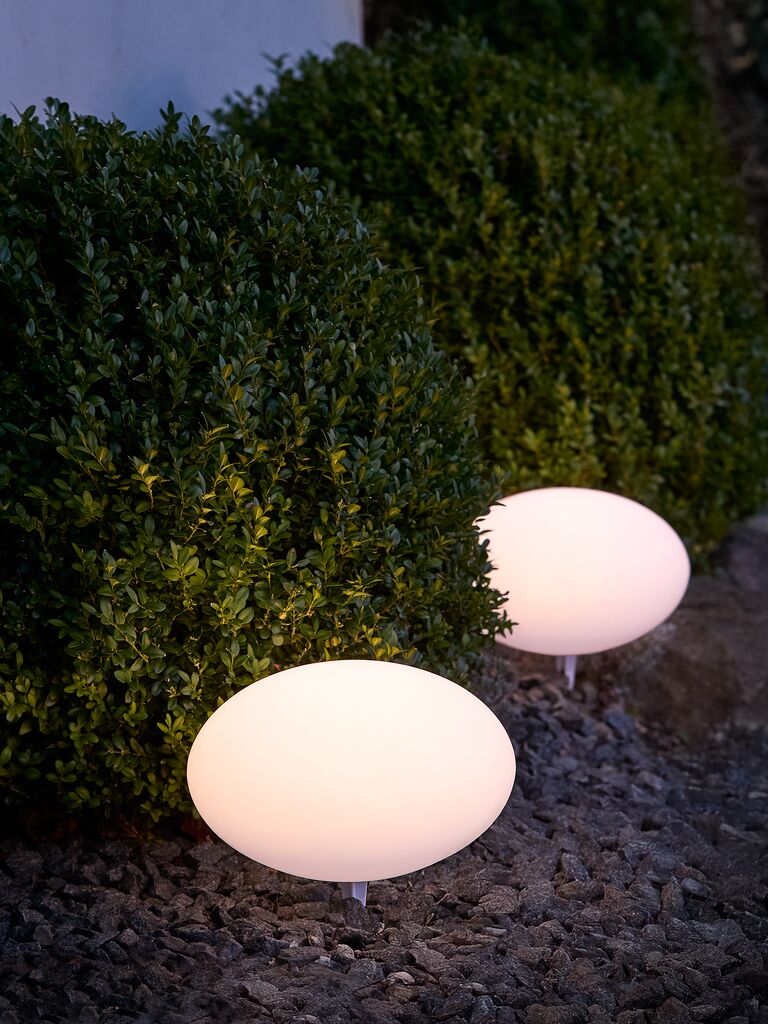 Biała lampa solarna w kształcie kuli, która oświetla ogród ciepłym blaskiem przez 5-6 godzin po zmroku. Prosty i elegancki design pasuje wszędzie. Ś25 x W17 cm