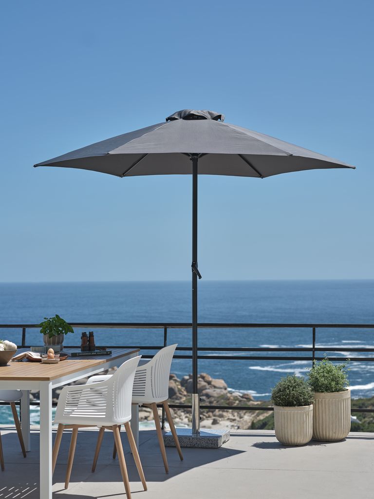 Zrelaksuj się w cieniu z parasolem ogrodowym NAPPEDAM. Ten ciemnoszary parasol ogrodowy z chronionym przed promieniowaniem UV, wodoodpornym baldachimem, uchwytem korbowym i solidnym stalowym drążkiem zachęca do relaksu na świeżym powietrzu. Ś250 x W238 cm