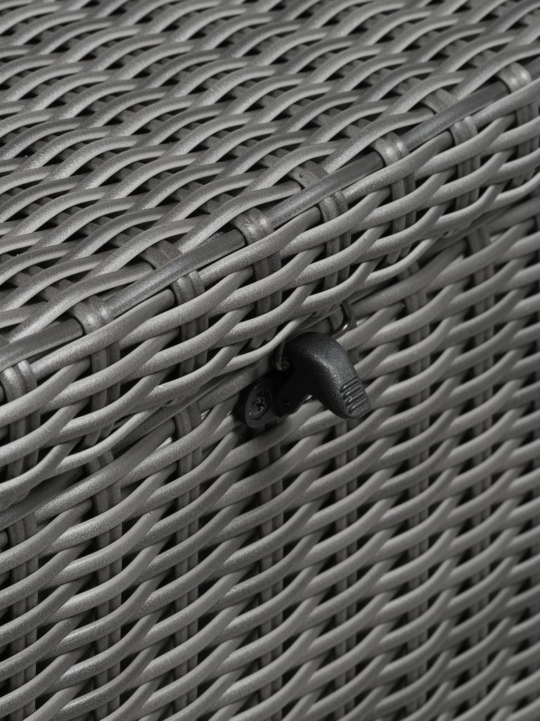 Skrzynia na poduszki ogrodowe z aluminium i technorattanu. Z ułatwiającą podnoszenie pokrywą hydrauliczną. Mrozoodporna. S150 x W91 x G77 cm