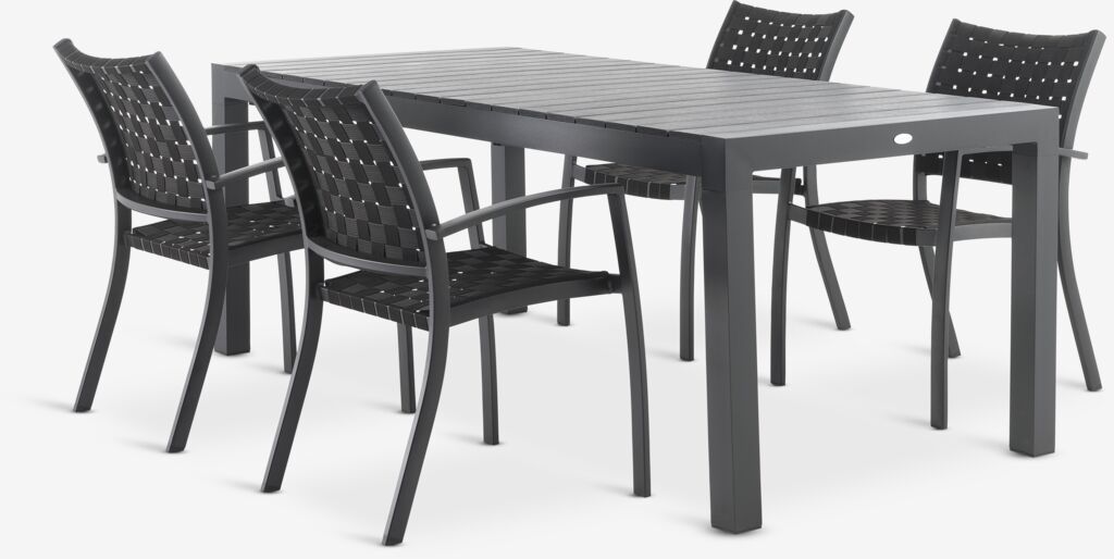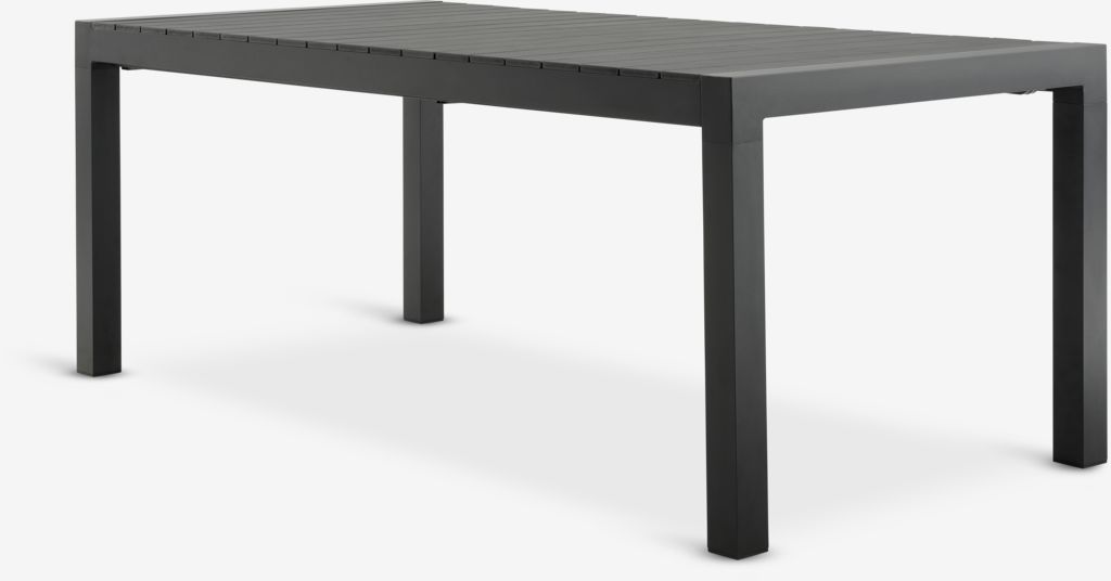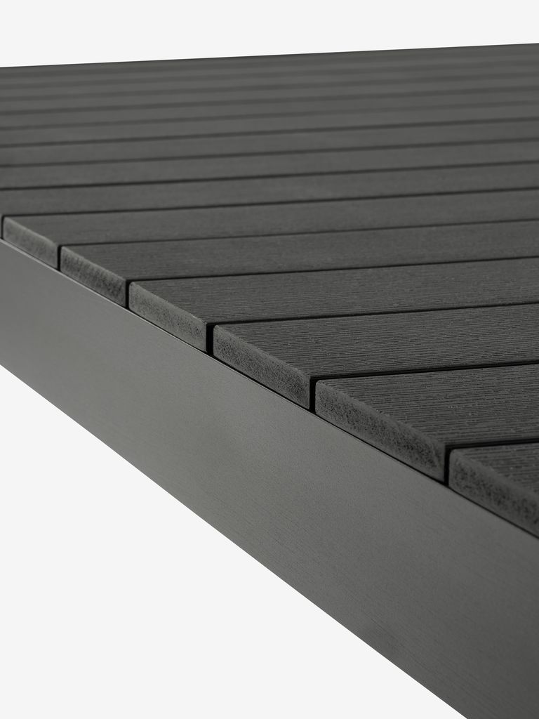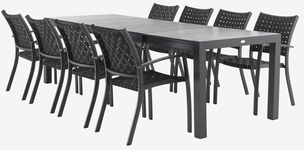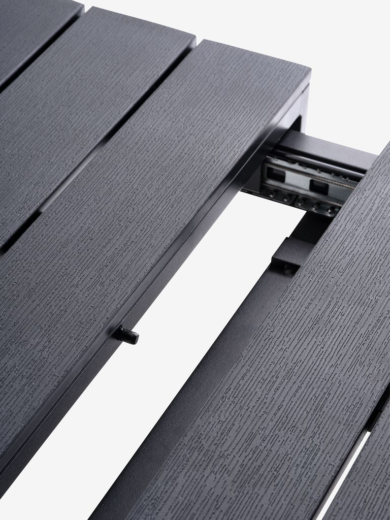 Stół: Aluminium i drewno syntetyczne. Z 1 blatem dodatkowym, który można przechowywać pod blatem. S95 x D205/275 x W76 cm. Krzesło: Aluminium i polipropylen. Nadaje się do ustawiania w stos.