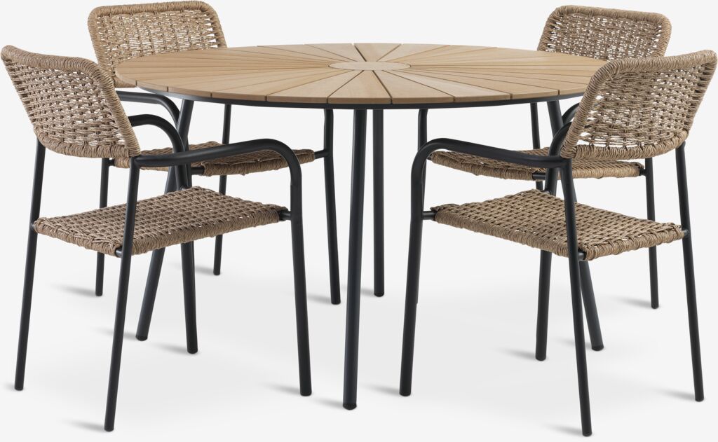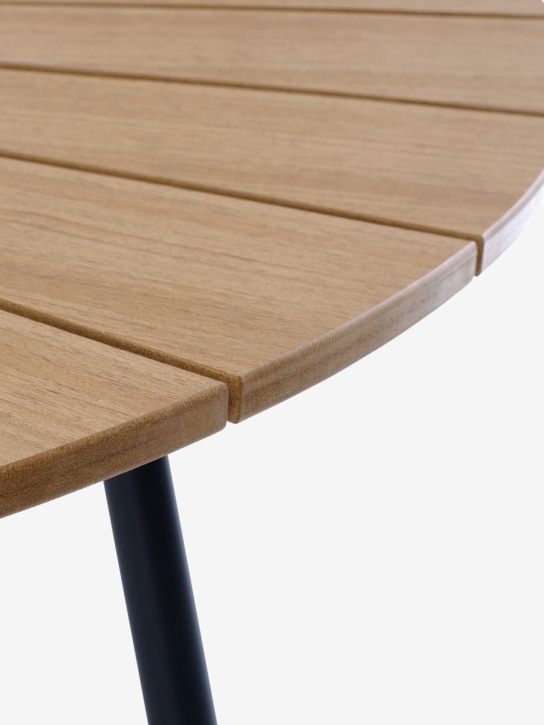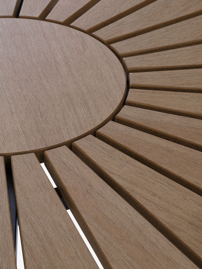 Stół: Aluminium i drewno syntetyczne. Ś130 x W74 cm. Krzesło: Stal i technorattan. Nadaje się do ustawiania w stos.