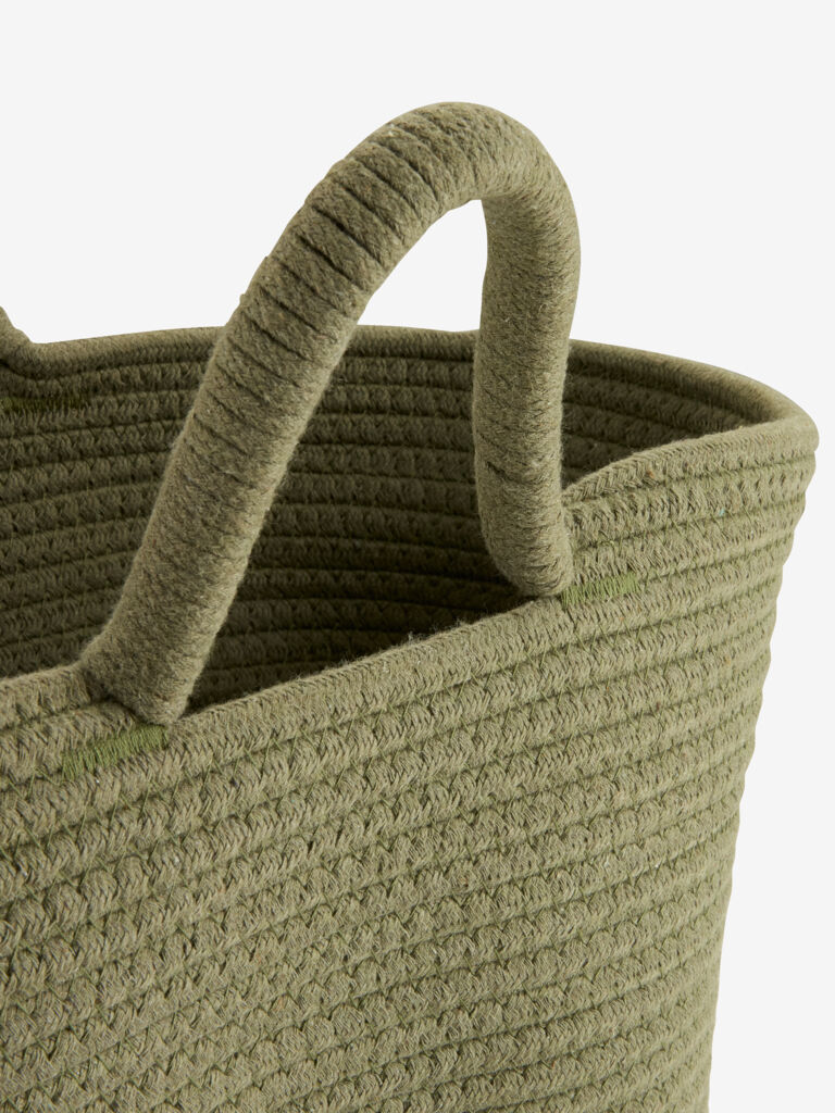 Kosz wykonany z miękkiej, tkanej tkaniny w kolorze ciemnooliwkowym. Praktyczne rozwiązanie do przechowywania przedmiotów, takich jak koce czy zabawki, wyposażony w dwa uchwyty ułatwiające przenoszenie. S30 x D41 x W30 cm
