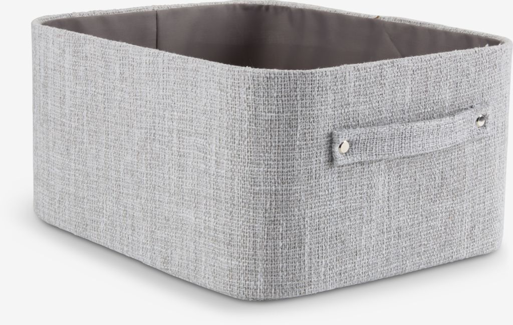 Kosz z jasnoszarej tkaniny z praktycznymi uchwytami. Jego kompaktowy kształt pasuje idealnie do szaf, pod stoły lub na półki. Idealny do przechowywania akcesoriów w przedpokoju, salonie lub sypialni. S32 x D27 x W16 cm