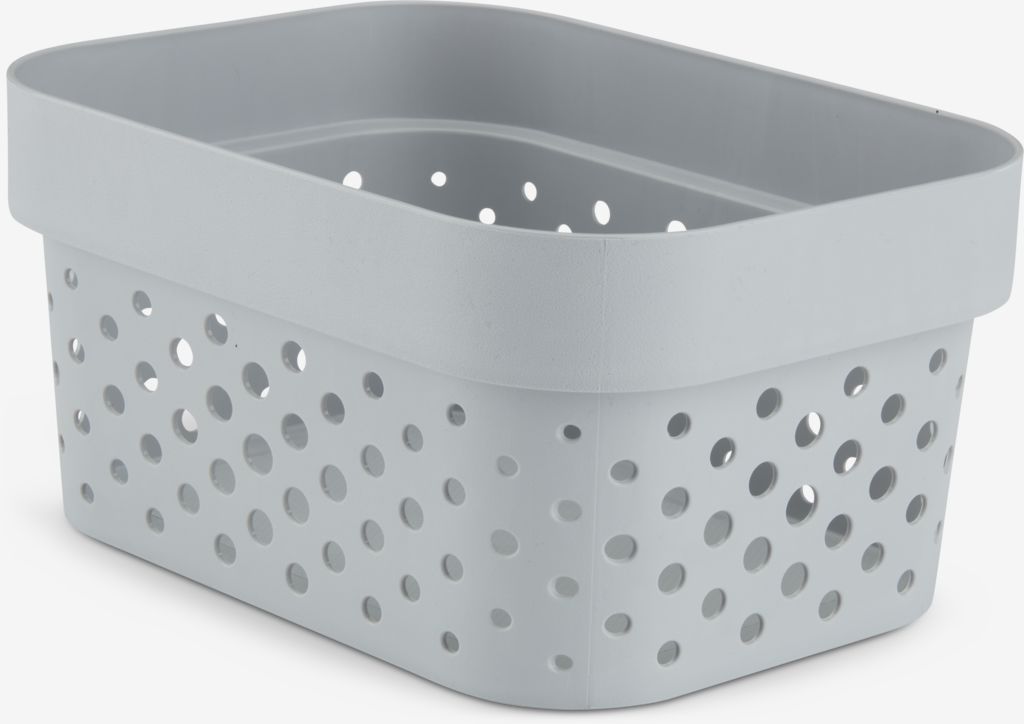 Szary kosz o pojemności 1,4 litra z praktycznym, perforowanym wzorem. Idealny do przechowywania różnych drobnych przedmiotów. Kosz wykonany jest z tworzywa sztucznego (100% z recyklingu), który jest łatwy do czyszczenia. S13 x D17 x W8 cm